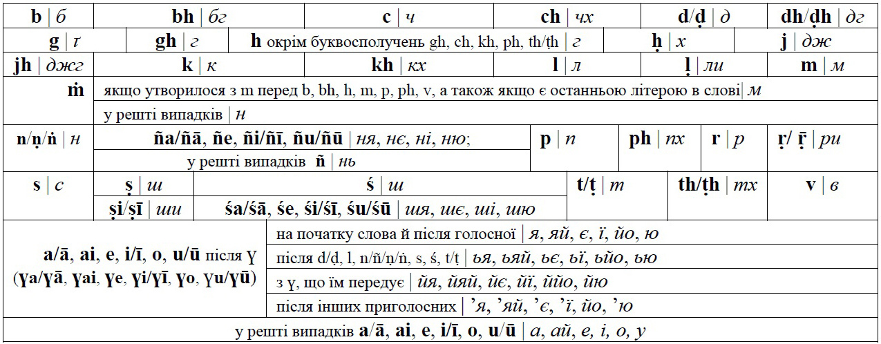 h (окрім буквосполучень gh, ch, kh, ph, th/ṭh) | г |